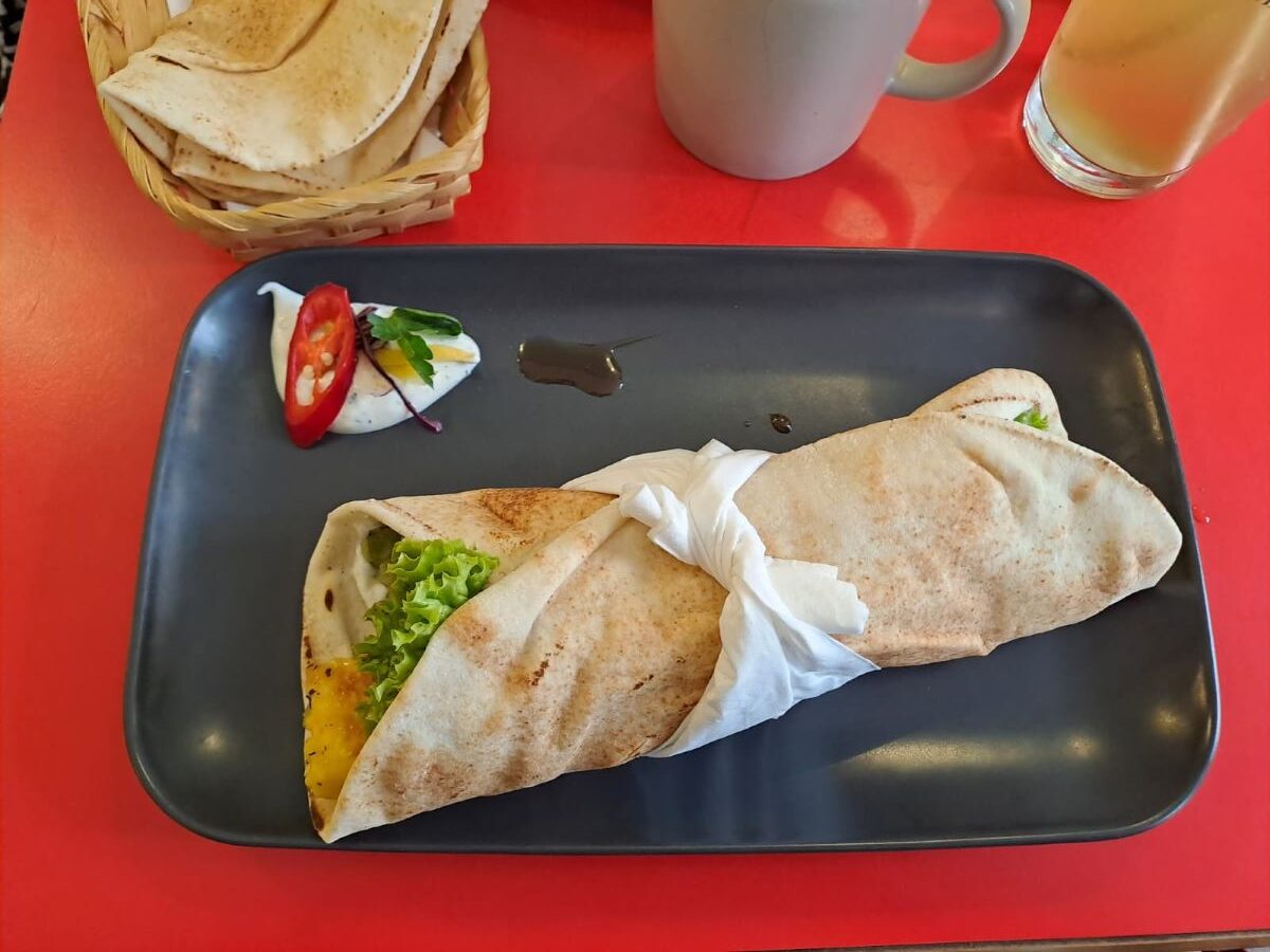 Heute ist Sonntag, der Abschluss meiner kulinarischen Woche und ich mache einen Abstecher ins Café Orient in der Neubaugasse 59, 1070 Wien. Schon von weitem sticht mir die rote Fassade ins Auge. Das Lokal wirkt einladend, aber auch ein bisschen wie ein Geheimtipp. Drinnen ist es ruhig, ideal zum Ankommen und Durchatmen an diesem gemütlichen Wochenendtag. Die Speisekarte liest sich wie eine kleine Reise durch den Nahen Osten: Orient-Wraps, Falafelteller, Mezze, Suppen und Salate, dazu syrisches Baklava und ein abwechslungsreiches Frühstücksangebot. Da es schon Nachmittag ist, entscheide ich mich für einen Halloumi-Wrap – frisch, würzig und perfekt getoastet – und dazu eine hausgemachte Ginger-Nana-Limonade mit Minze und Ingwer. Während ich warte, genieße ich das orientalische Flair und nehme mir vor, beim nächsten Mal ein paar Mezze zu probieren oder abends für einen Spritzer oder Longdrink vorbeizuschauen, denn ich kann mir vorstellen, dass das Café dann richtig gut besucht ist.