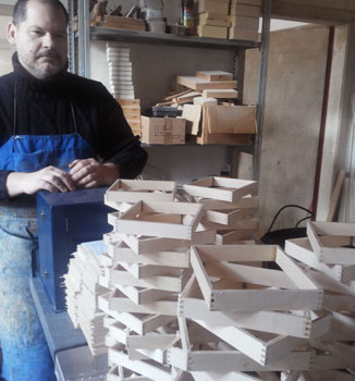 Zur Demonstration der einzelnen Arbeitsschritte öffnet Fritz Fialka nun die Tür zur Werkstatt. Und tatsächlich: der Eingang in eine vergangene Welt des Handwerks. Linker Hand befindet sich die Holzwerkstatt, dort werden die Holzleisten fachgerecht mit der Kreissäge zugeschnitten. Danach mit der Fräse gezinkt, verleimt und abgelängt. Erkennbar sind nun schon die Grundkörper der Etuis. Berge von kleinen Rähmchen türmen sich übereinander und warten auf Weiterverarbeitung.
