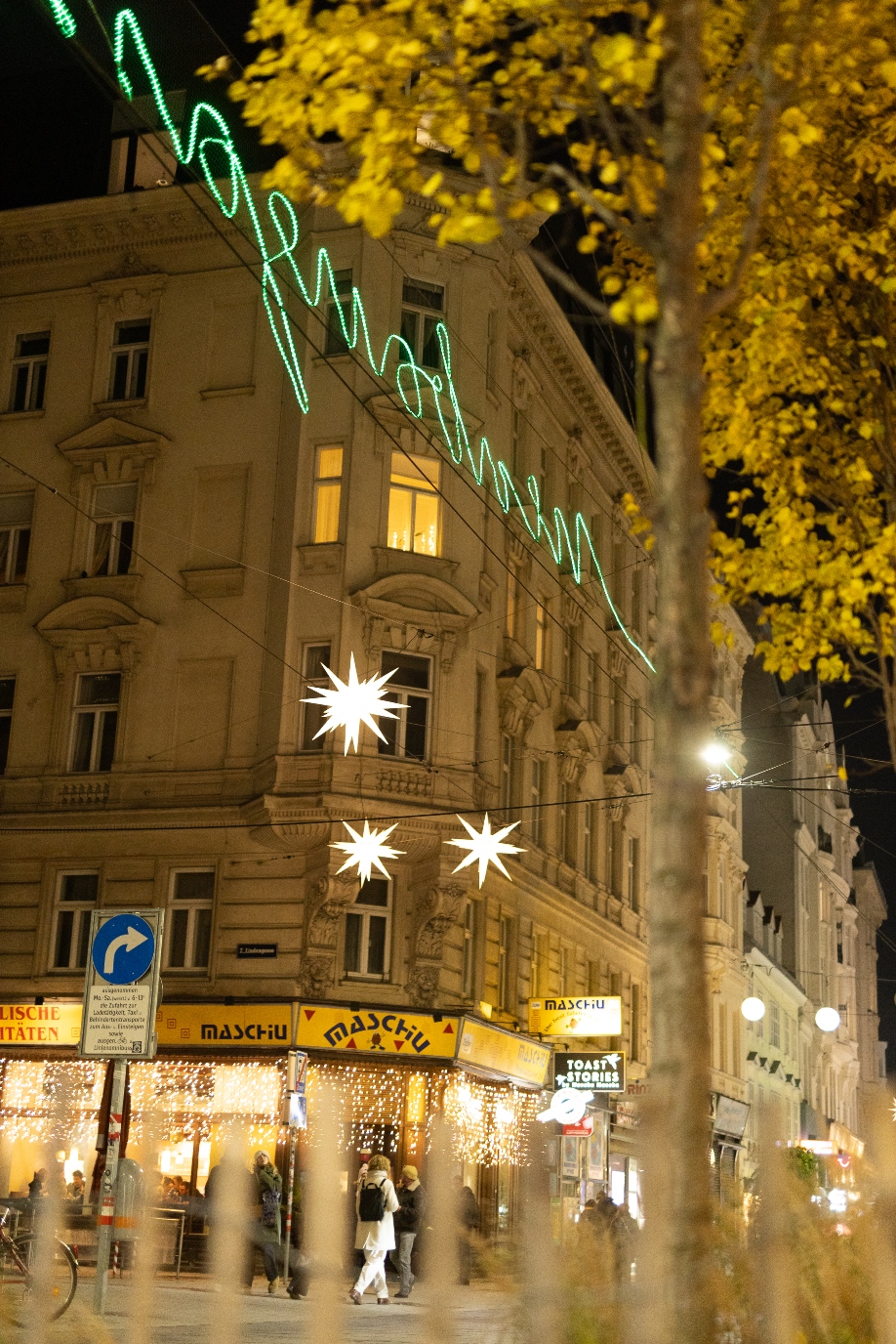 Im Advent leuchten in der Neubaugasse zusätzlich zur Ganzjahresbeleuchtung die Herrnhutter Sterne. Foto: © Lukas Fuchs